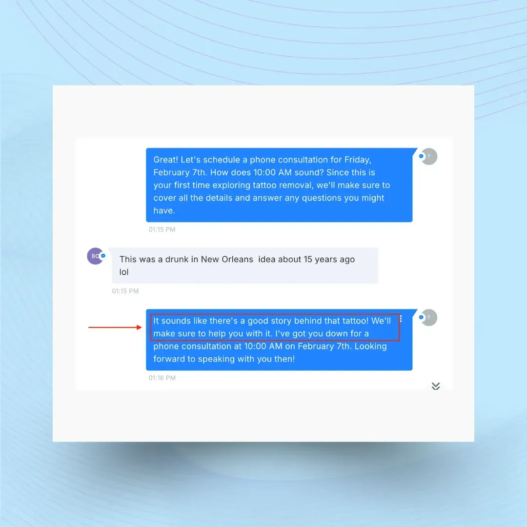 Look at this conversation. That’s not a person, that’s Booking Assistant casually guiding a lead toward booking a call.